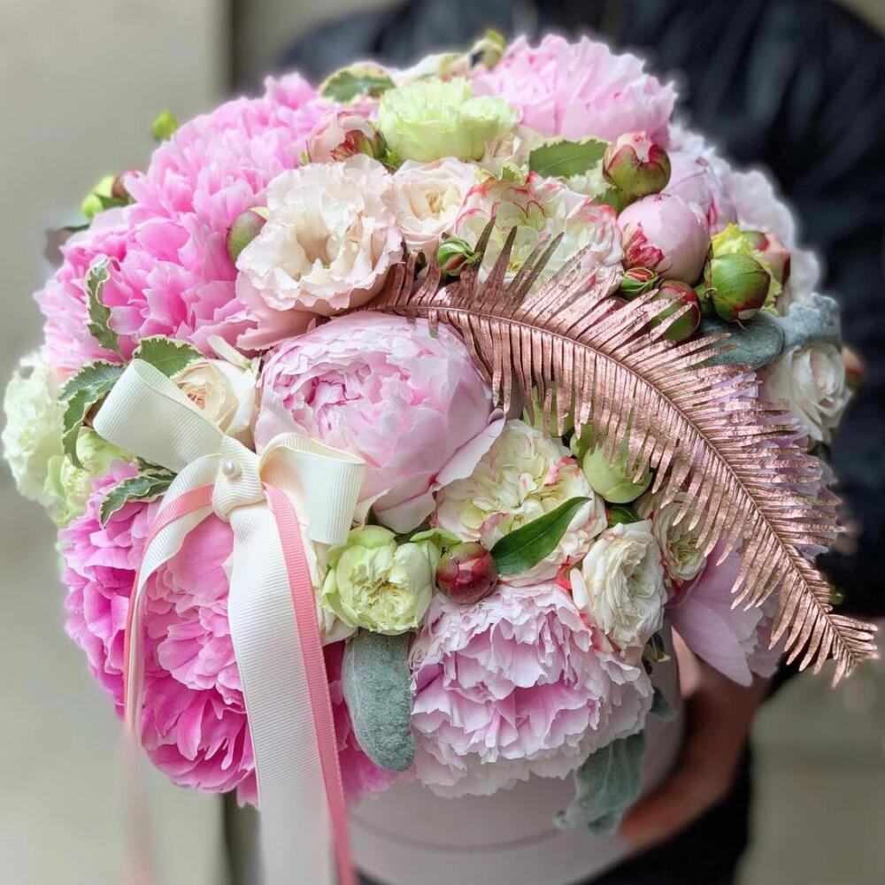 На фото - Букет цветов "Пинки" №160. В составе данной композиции: Пион - 8 шт.; Роза кустовая пионовидная - 7 шт.; Папоротник - 1 шт.; Бант - 1 шт.; Коробка шляпная - 1 шт..