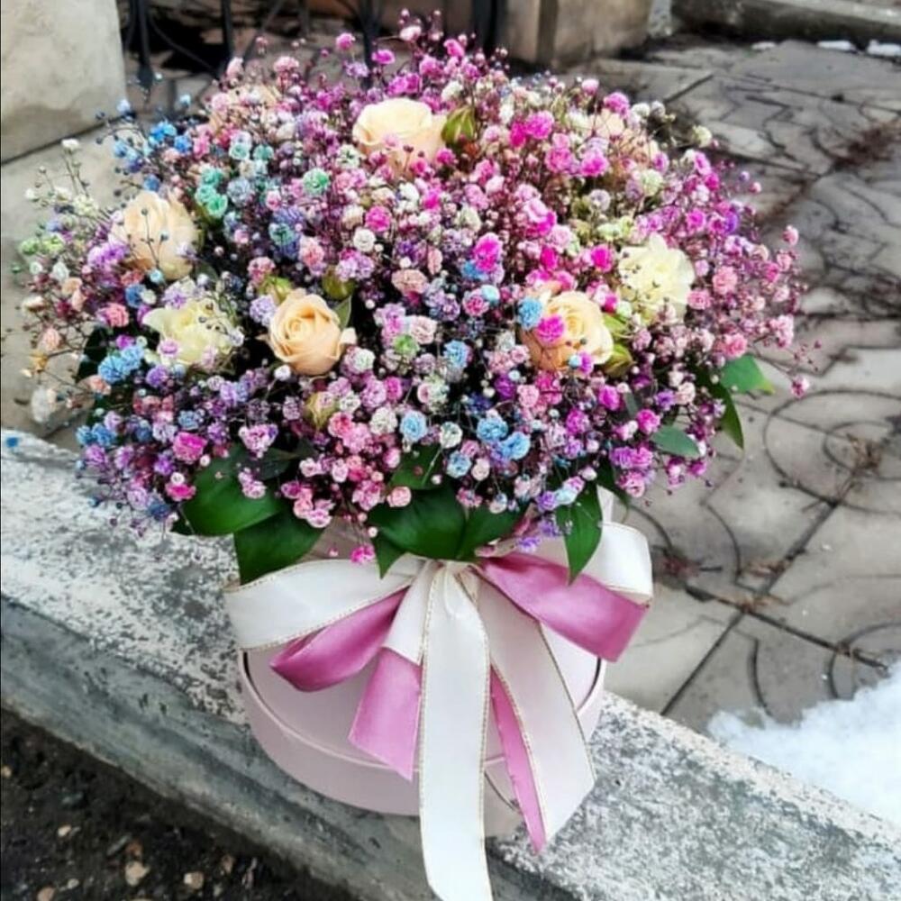 На фото - Букет цветов "Я тебя люблю" №179. В составе данной композиции: Шляпная коробка - 1 шт.; Оазис - 1 шт.; Лента атласная - 2 шт.; гипсофила радужная - 9 шт.; Роза кустовая - 5 шт.; зелень микс - 7 шт..