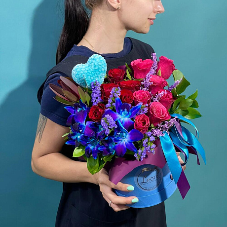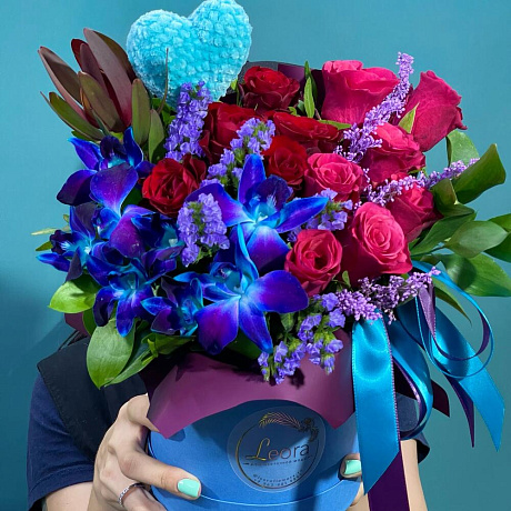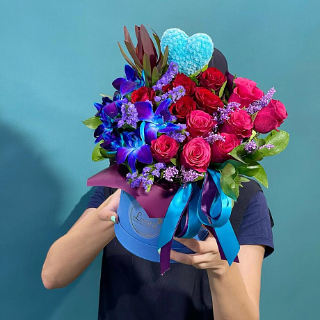 На фото - Букет цветов "Пылкий Космос" №161. В составе данной композиции: дендробиум космос - 7 шт.; роза микс - 11 шт.; Статица - 2 шт.; сердце вязанное ручная работа - 1 шт.; деукодендрон - 1 шт.; Шляпная коробка - 1 шт.; Рускус - 1 шт.; Солидаго - 1 шт..