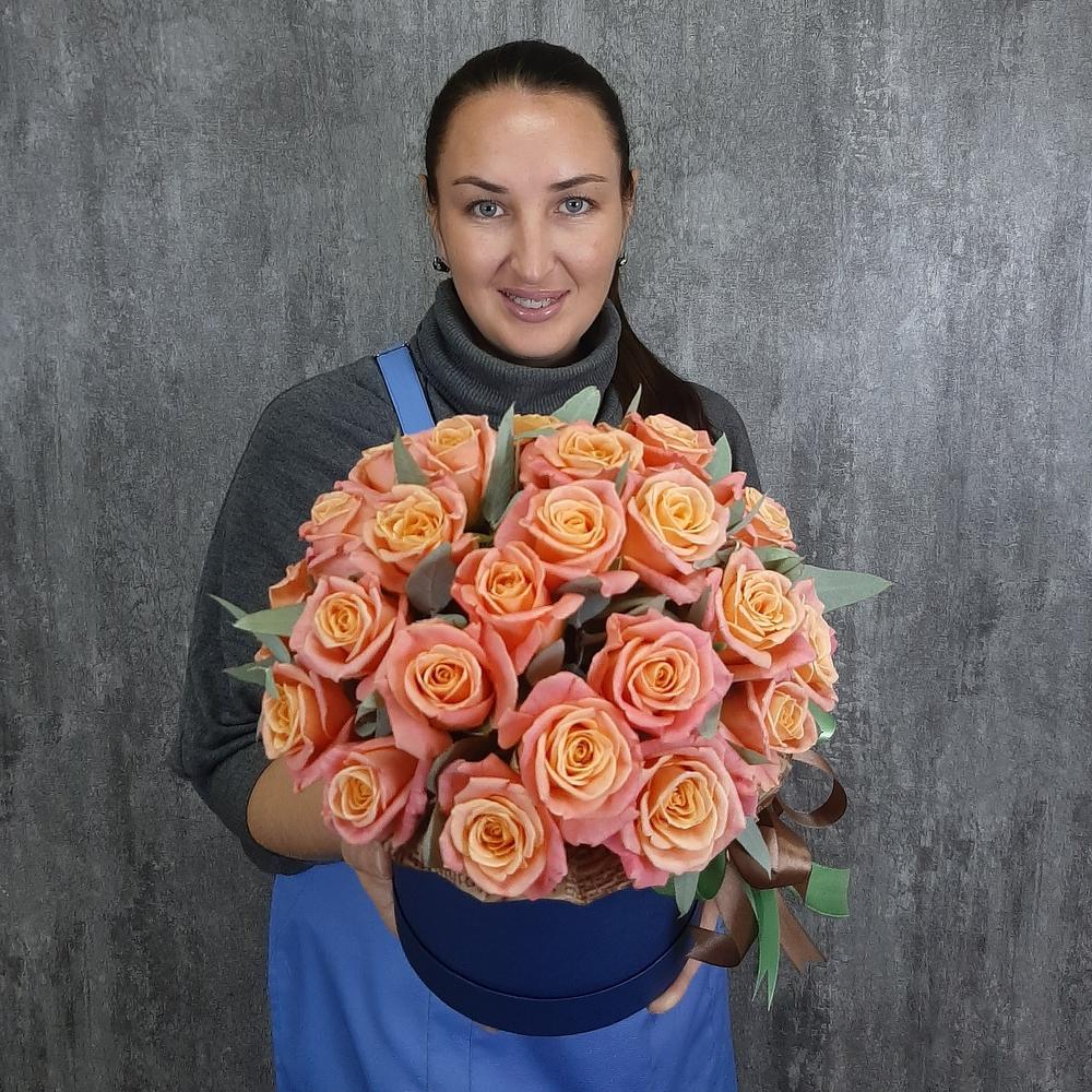 На фото - Букет цветов "Розовое вино" №162. В составе данной композиции: Роза Мисс Пигги - 29 шт.; Эвкалипт пучок - 1 шт.; Шляпная коробка - 1 шт.; Декор - 3 шт..