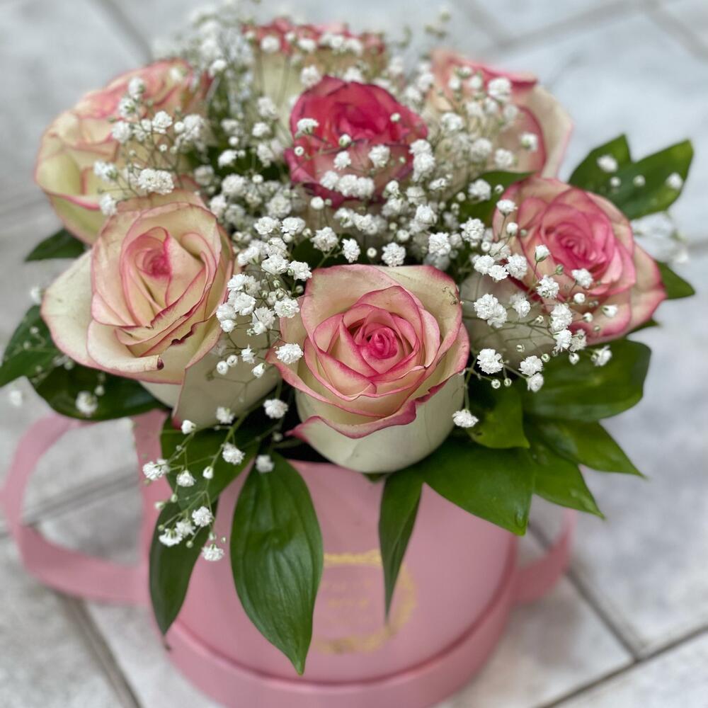 На фото - Букет цветов "Розовый Закат" №163. В составе данной композиции: Роза Джумилия - 7 шт.; гипсофила белая - 1 шт.; Рускус пучок - 3 шт..