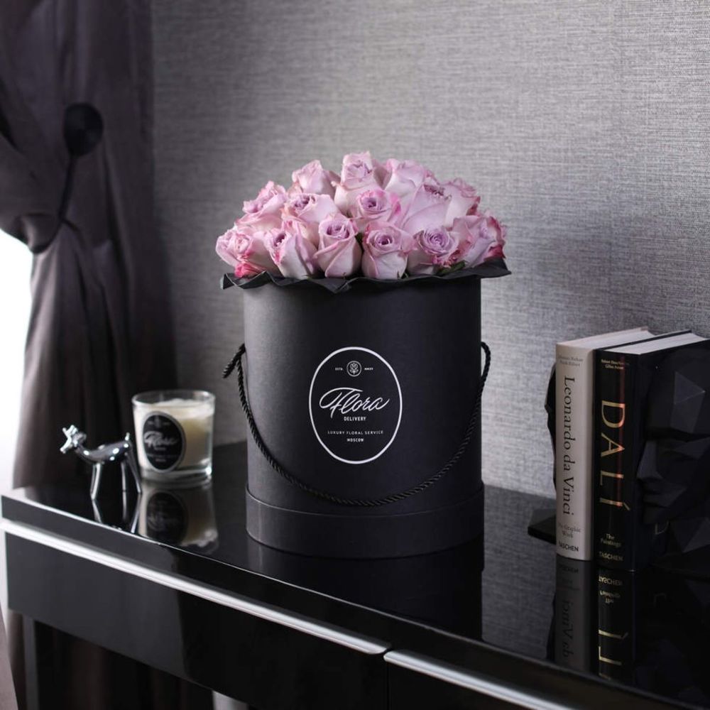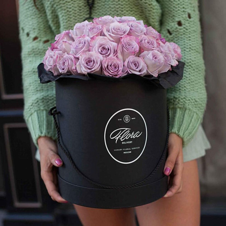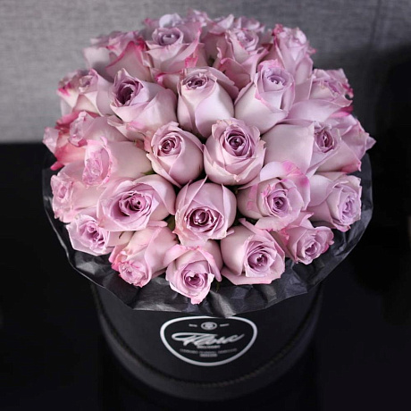 На фото - Розы Purple в шляпной коробке Grand B ack. В составе данной композиции: Шляпная коробка grand black - 1 шт.; Роза purple - 31 шт.; Ваза - 1 шт..