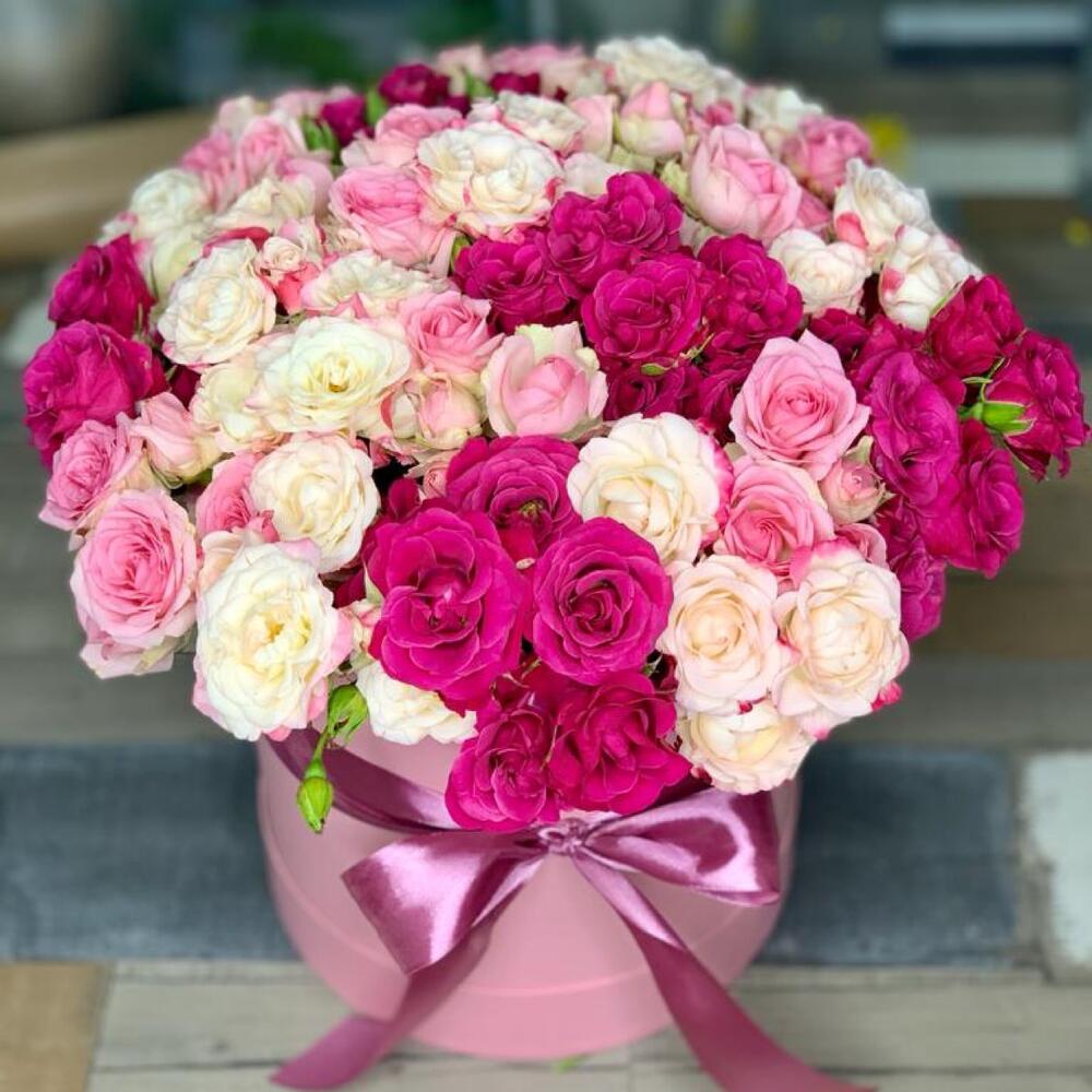На фото - Розы в коробке №182. В составе данной композиции: роза кустовая микс - 31 шт.; Коробка шляпная - 1 шт.; Оазис флористический - 3 шт.; Лента атласная - 2 шт..