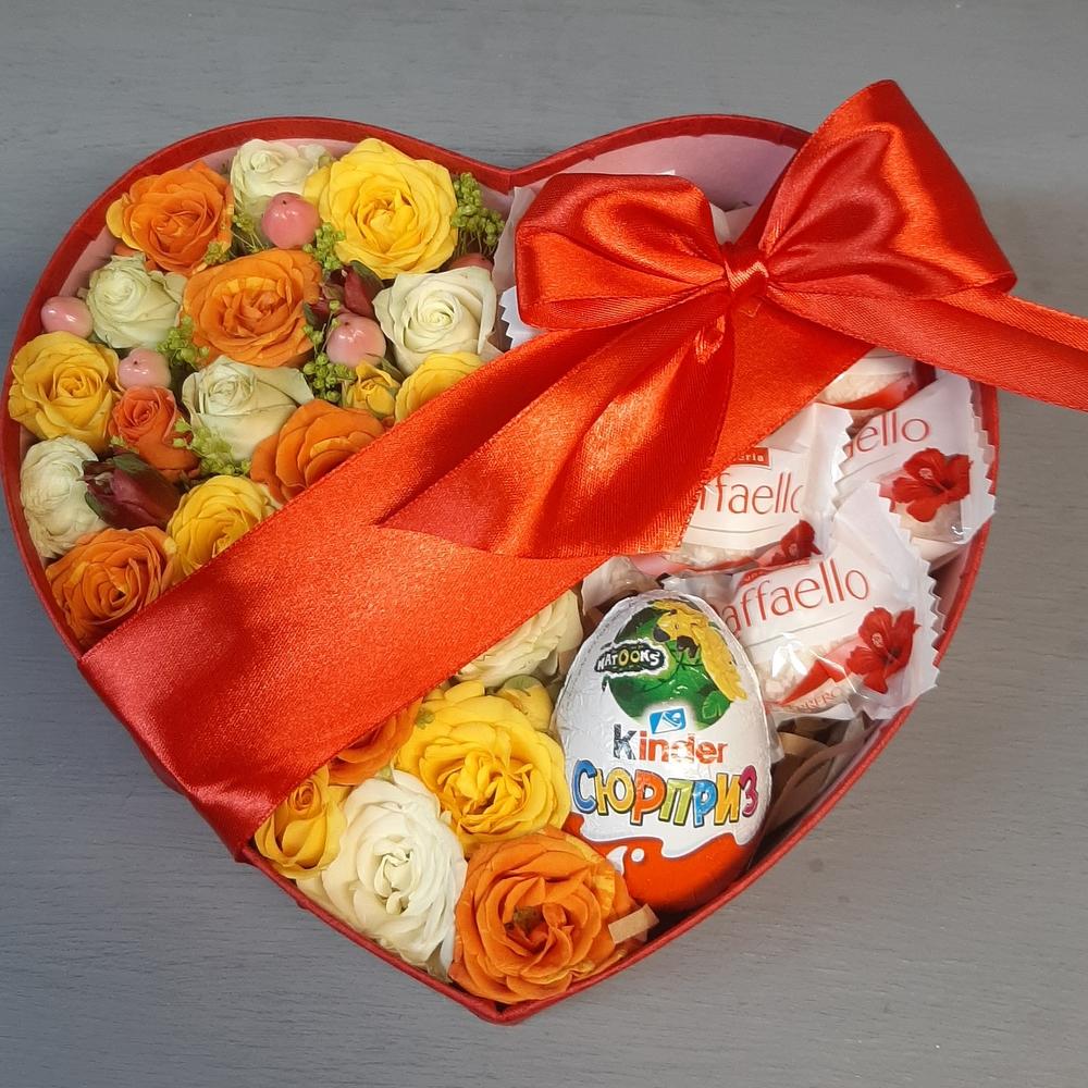На фото - Букет цветов "с любовью" №202. В составе данной композиции: роза кустовая микс - 7 шт.; Гиперикум - 2 шт.; Киндер сюрприз - 1 шт.; Раффаэлло - 7 шт.; коробка сердце большая с крышкой - 1 шт.; Оазис флористический - 1 шт..