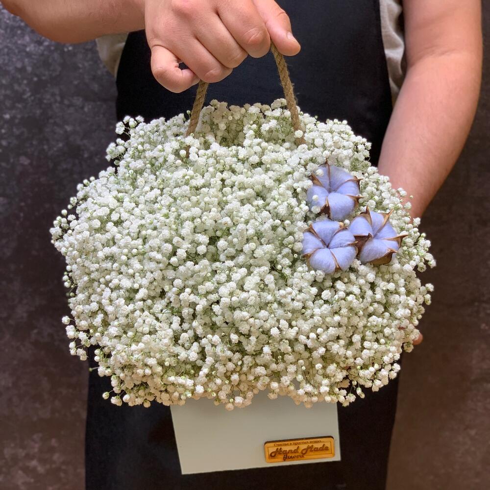 На фото - Букет цветов "Сахарная вата" №164. В составе данной композиции: гипсофила белоснежная - 21 шт.; ящик ручной работы с канатной ручкой - 1 шт.; Хлопок натуральный - 3 шт.; Оазис флористический - 1 шт..
