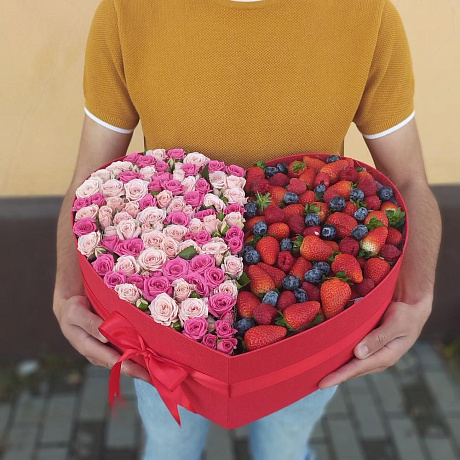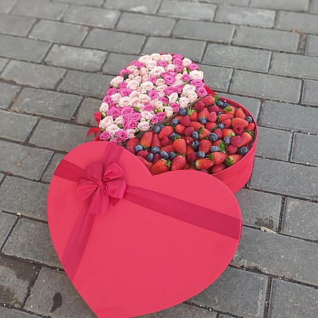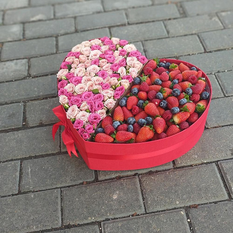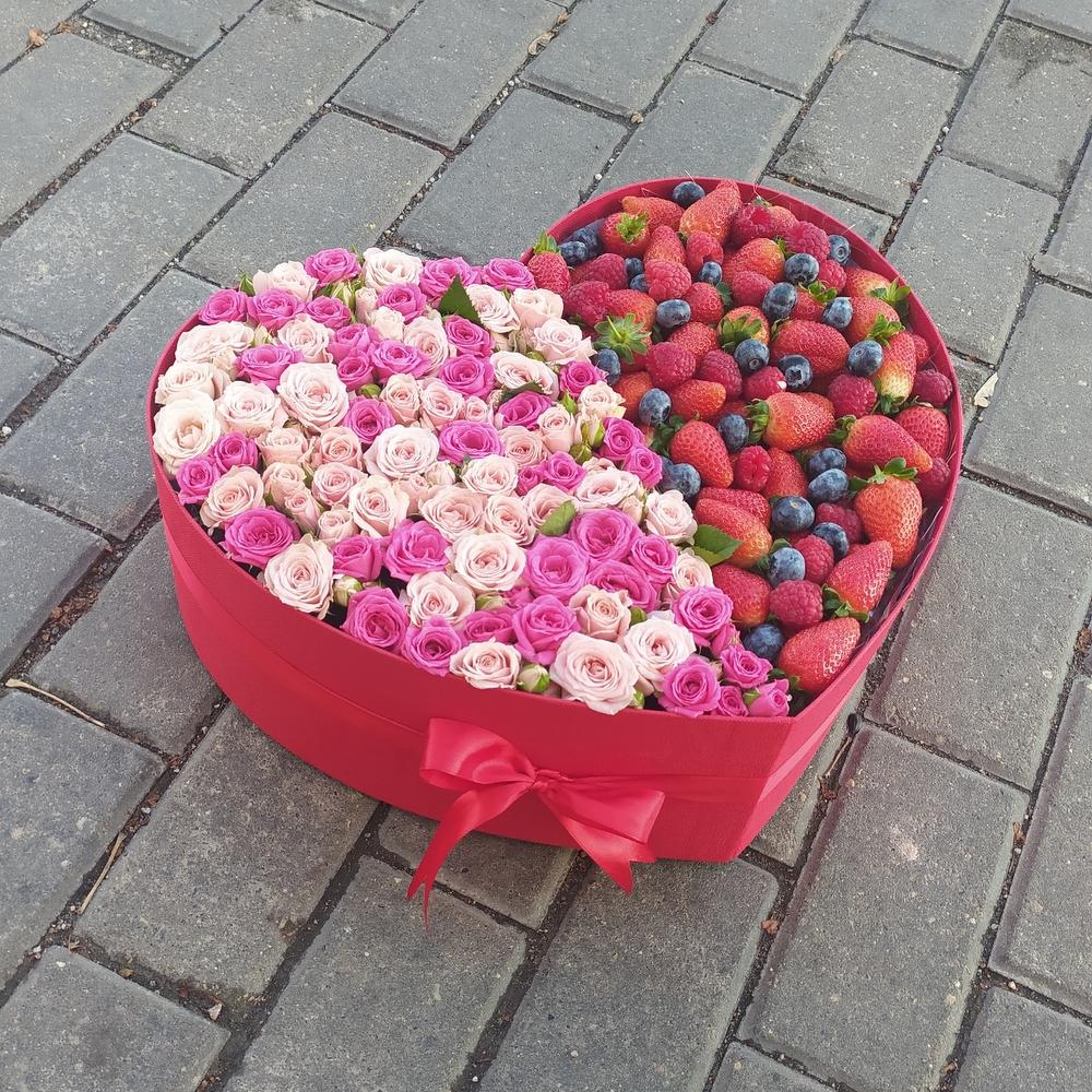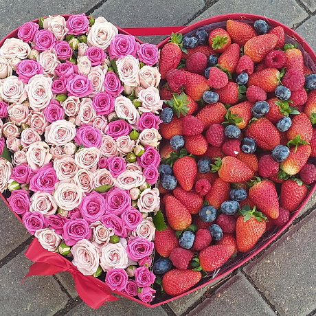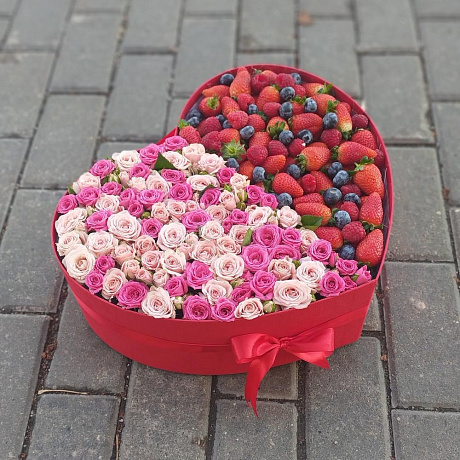 На фото - Букет цветов "Моё сердце" №6. В составе данной композиции: Кустовая роза Лидия - 10 шт.; Кустовая роза малиновая - 9 шт.; Клубника - 1200 гр.; Малина - 150 гр.; Голубика - 150 гр.; Коробка сердце - 1 шт.; Лента атласная - 1 шт.; Оазис флористический - 1 шт..