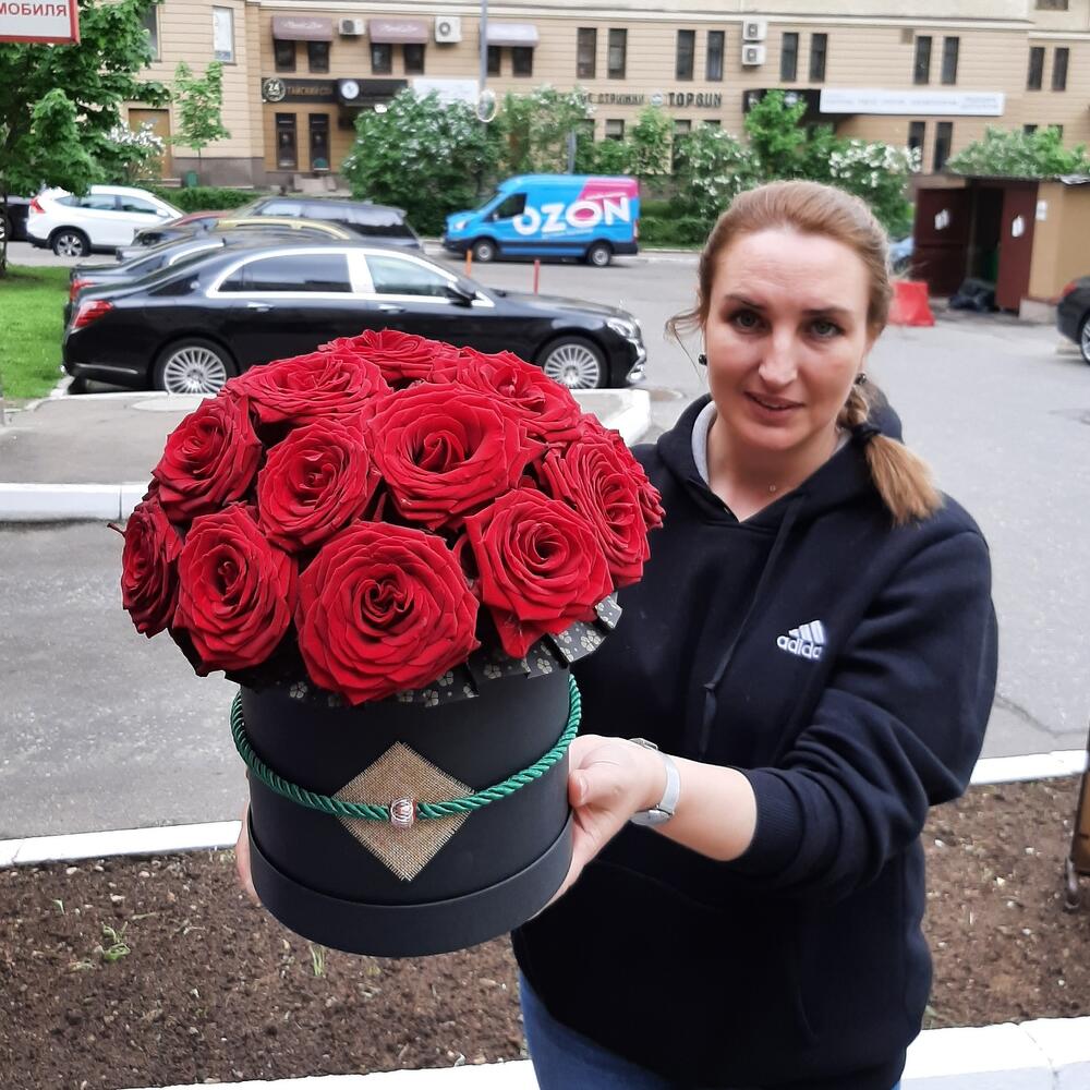 На фото - Букет цветов "Шик" №166. В составе данной композиции: Роза red naomi - 21 шт.; Шляпная коробка - 1 шт.; Декор - 4 шт..