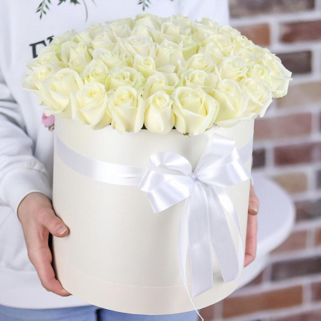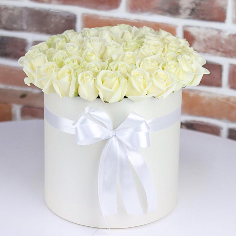 У нас можно заказать Шляпная коробка из 51 белой розы. N711 с доставкой по Москве.