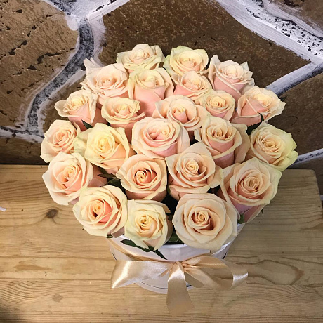 На фото - Шляпная коробочка с кремовыми розами. В составе данной композиции: Роза Талея - 23 шт.; Шляпная коробка с лентами - 1 шт.; Оазис флористический - 1 шт..