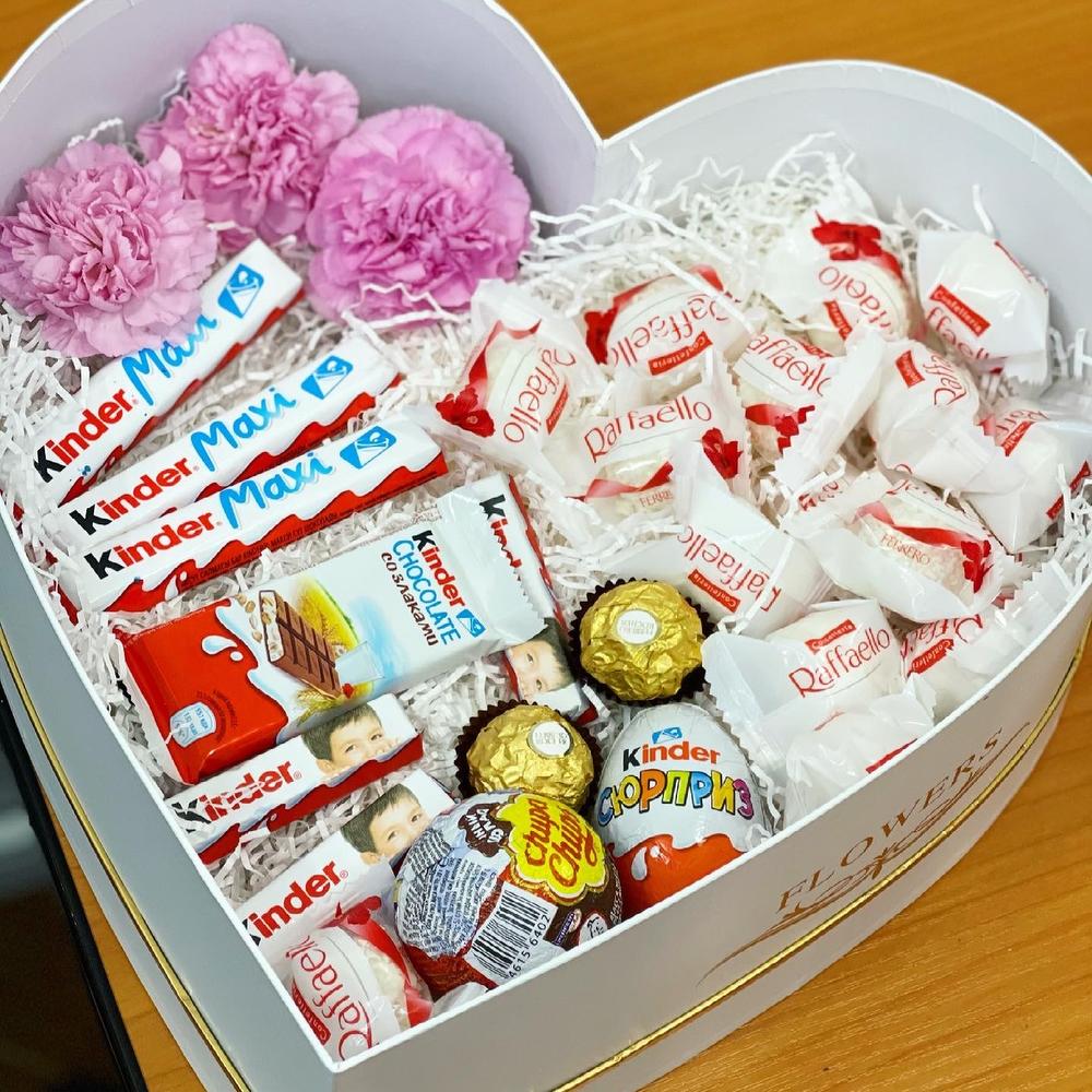 <p>На фото - Букет "Сладкоежка" №161. В составе данной композиции: раффаэлло 150 гр - 1 шт.; ферреро роше - 2 шт.; Киндер сюрприз - 1 шт.; киндер шоколад микс - 7 шт.; чупа чупс шоколад - 1 шт.; Лунная гвоздика - 3 шт.; Наполнитель стружка - 1 шт.; Коробка - 1 шт..</p> <p>На сайте "Доступная доставка цветов" Вы найдете большой выбор недорогих букетов, цветочных композиций для любого повода.</p> <p>У нас можно заказать Букет "Сладкоежка" №161 с доставкой по Москве.</p>
