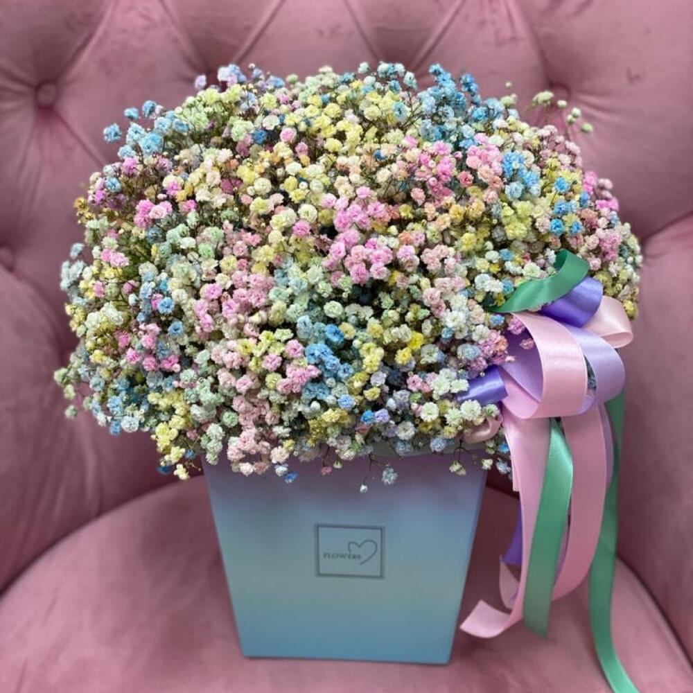 На фото - Букет цветов "Волшебство" №167. В составе данной композиции: Коробка шляпная - 1 шт.; Гипсофила Мирабелла 95 г - 5 шт..