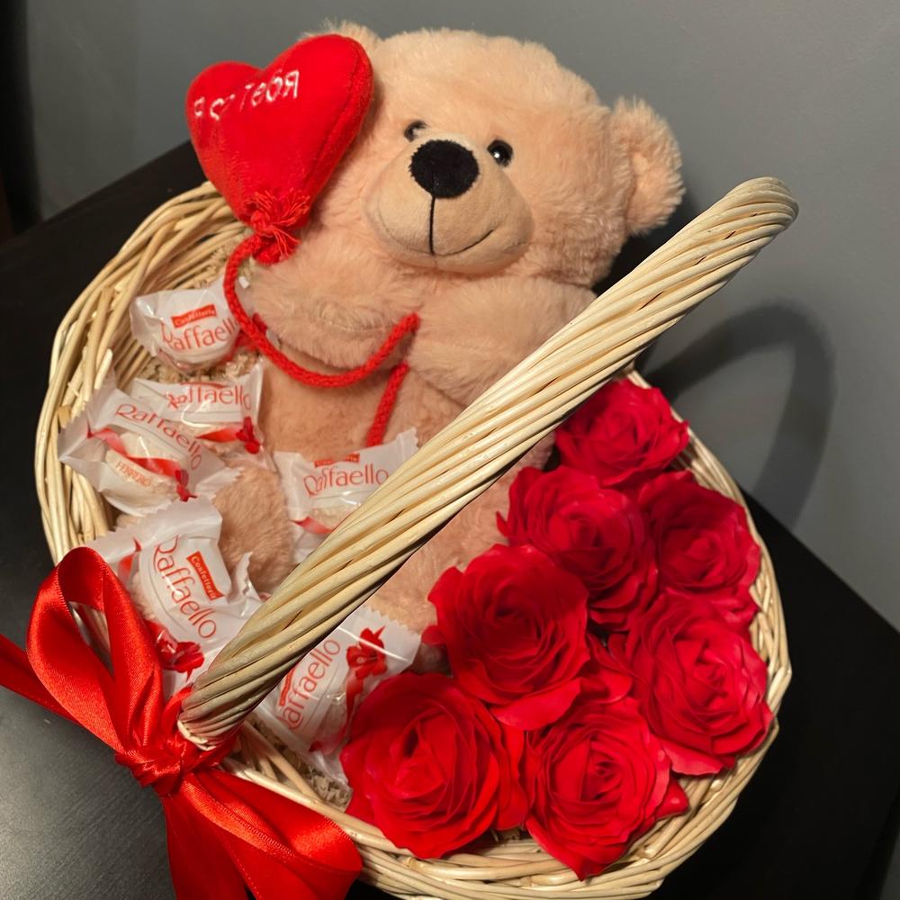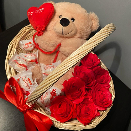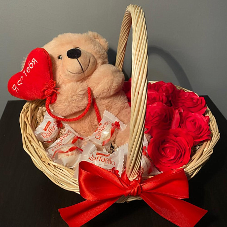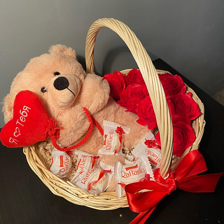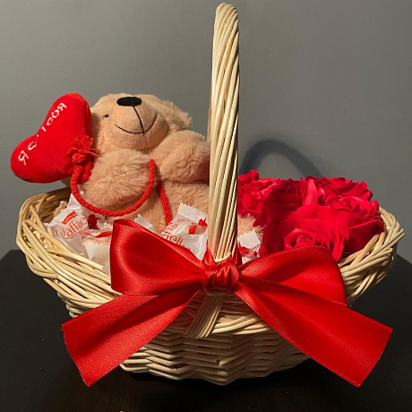 <p>На фото - Букет цветов "Минка-Романтик maxi". В составе данной композиции: Корзина плетеная - 1 шт.; Наполнитель стружка - 100 гр.; Оазис флористический - 1 шт.; мыльные цветы ароматизированные - 7 шт.; Мишка плюшевый - 1 шт.; Раффаэлло - 8 шт.; Лента атласная - 1 шт..</p> <p>На сайте "Доступная доставка цветов" Вы найдете большой выбор недорогих букетов, цветочных композиций для любого повода.</p> <p>У нас можно заказать Букет цветов "Минка-Романтик maxi" с доставкой по Москве.</p>