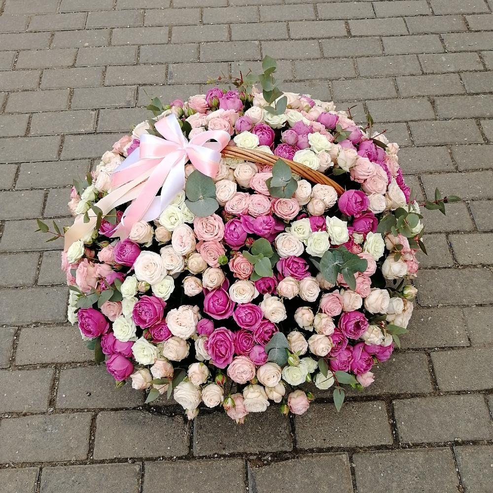 На фото - Букет цветов "Долгожданное счастье" №161. В составе данной композиции: Пионовидная кустовая роза - 201 шт.; Корзина - 1 шт.; Флористическая губка (оазис) - 8 шт.; Атласная лента - 2 шт..
