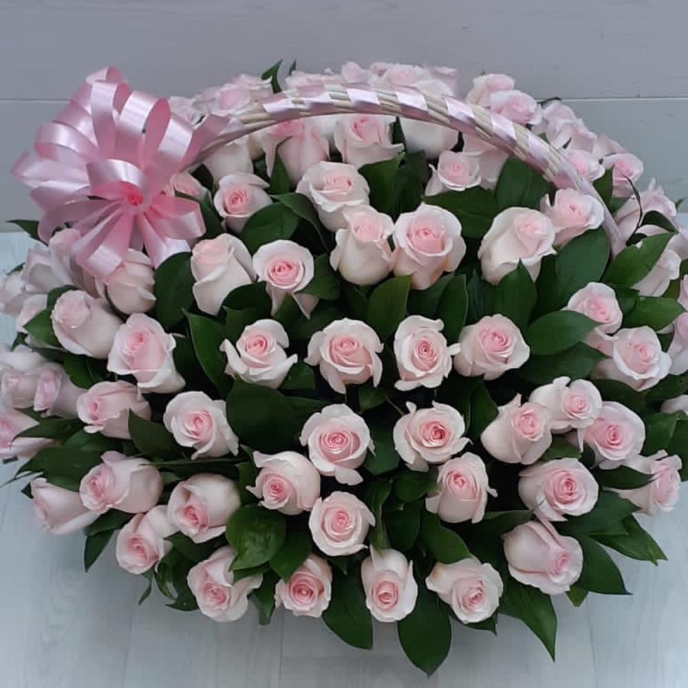 На фото - Корзина с цветами №284. В составе данной композиции: Роза розовая - 101 шт.; Корзина плетеная - 1 шт.; Оазис флористический - 4 шт.; Зелень - 2 шт.; бант розовый - 1 шт..