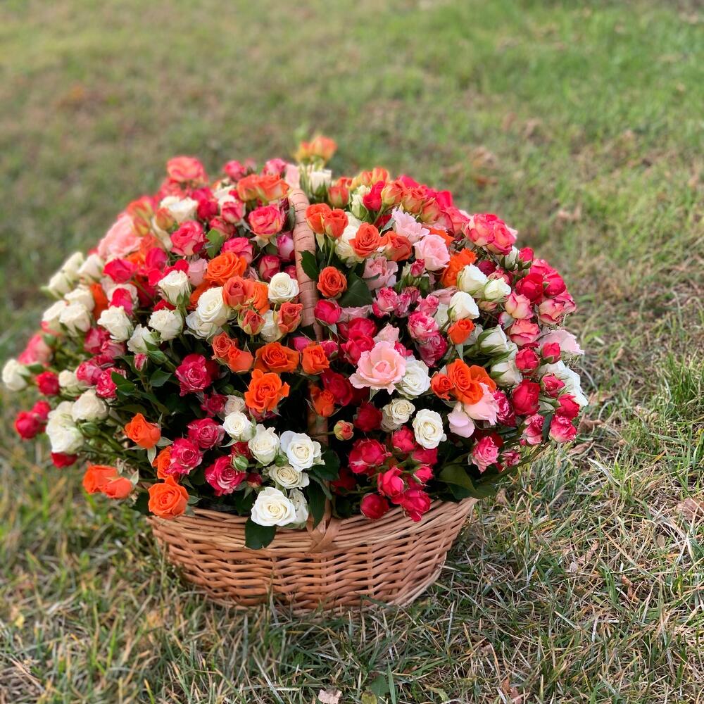 Состав: кустовая роза микс - 101 шт.; Корзина плетеная - 1 шт.; Оазис флористический - 5 шт.; Открыточка с вашими пожеланиями - 1 шт.