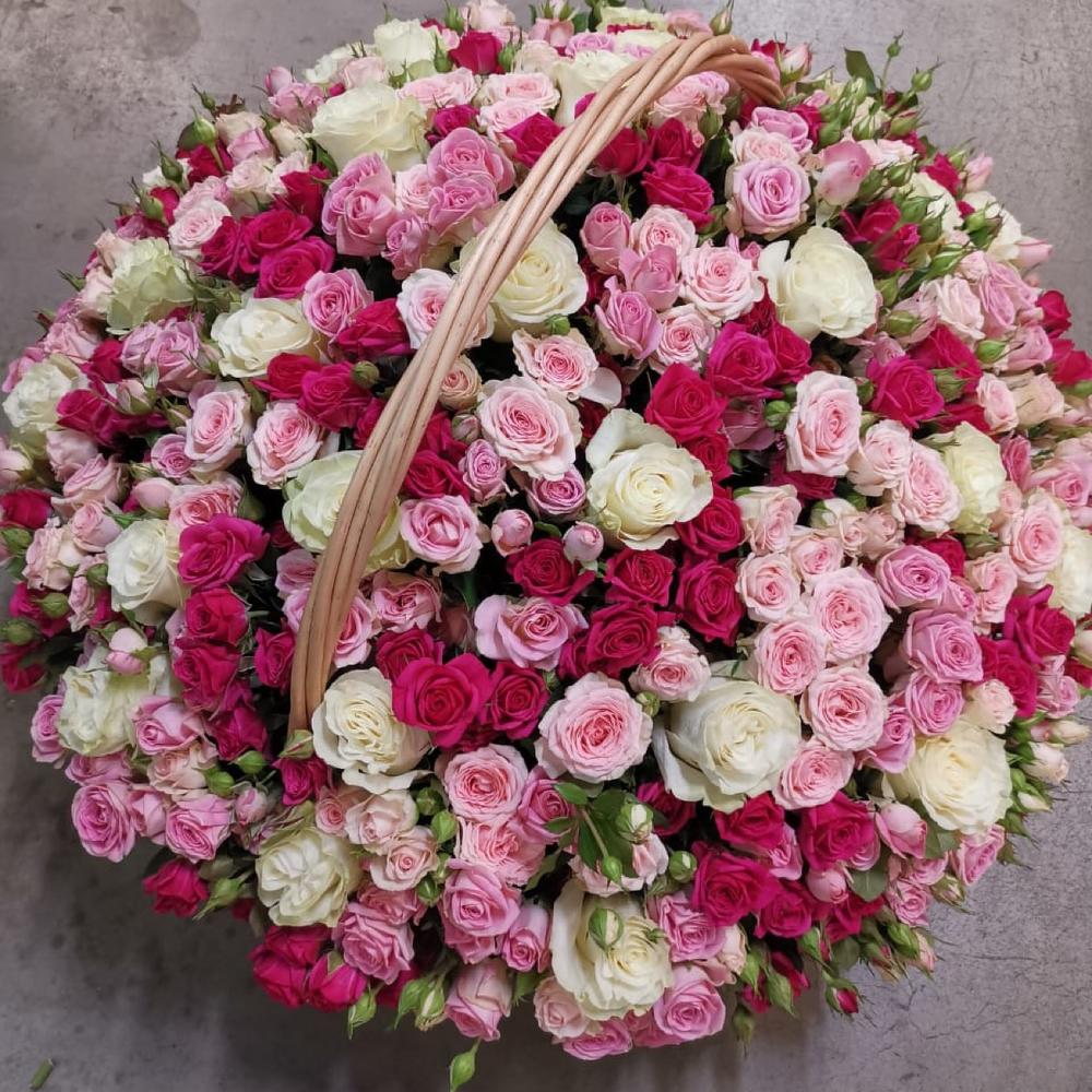 На фото - Корзина с розами №167. В составе данной композиции: Роза кустовая - 50 шт.; роза мандиаль - 21 шт.; Корзина - 1 шт.; Лента атласная - 5 шт..