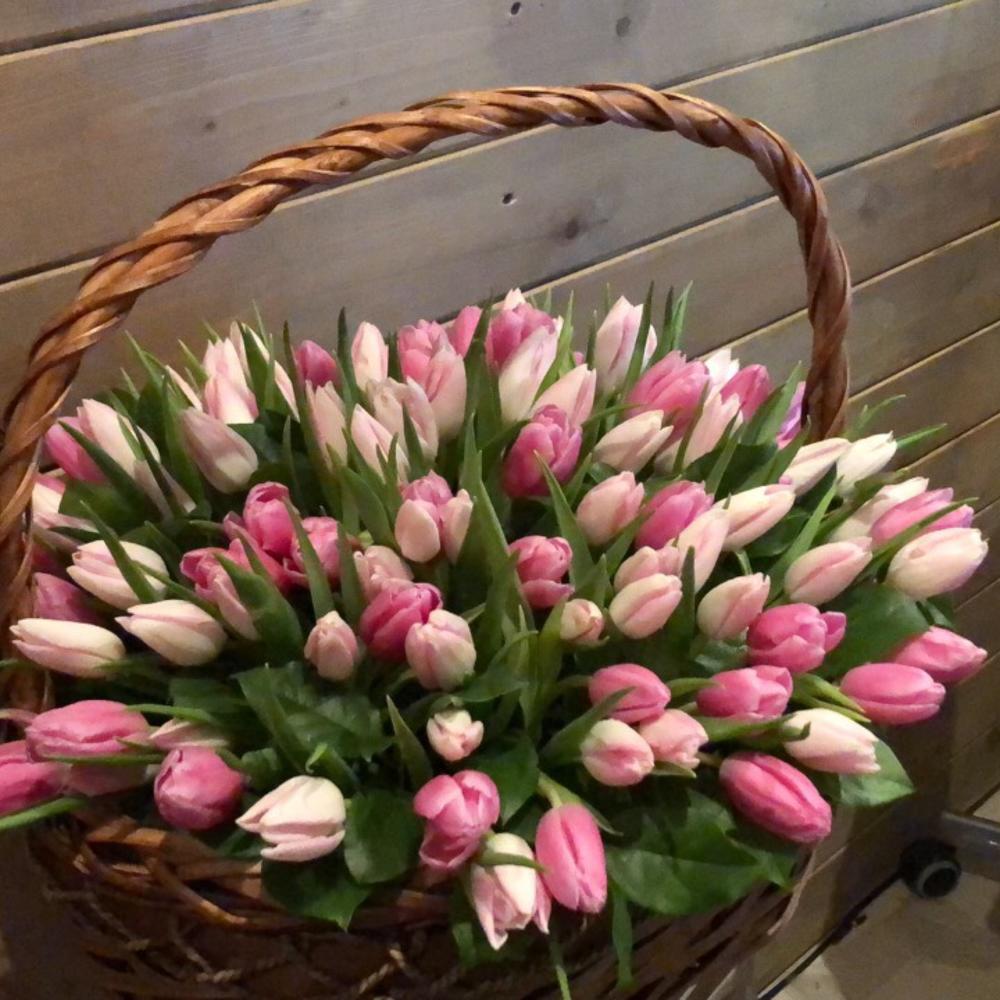 На фото - Корзина с розовыми тюльпанами №162. В составе данной композиции: Тюльпан - 75 шт..