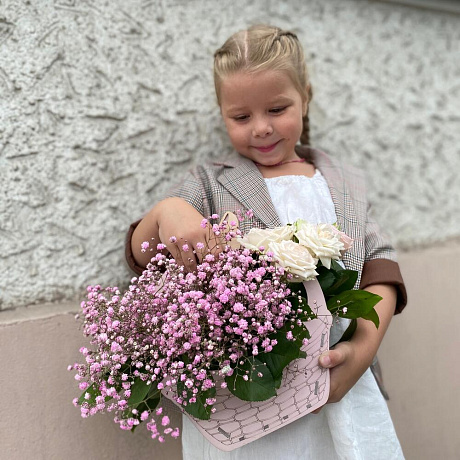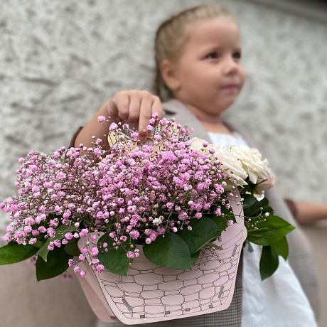 На фото - Корзина цветов для девочек. В составе данной композиции: Гипсофила - 9 шт.; Роза - 6 шт.; Корзина деревянная - 1 шт..