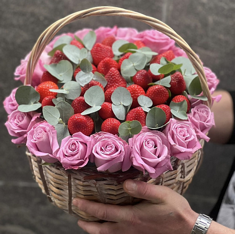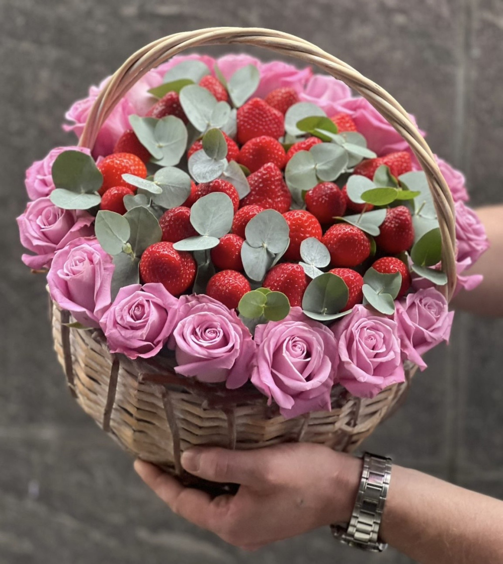 У нас можно заказать Корзины с цветами .Клубника с белой розой. N615 с доставкой по Москве.