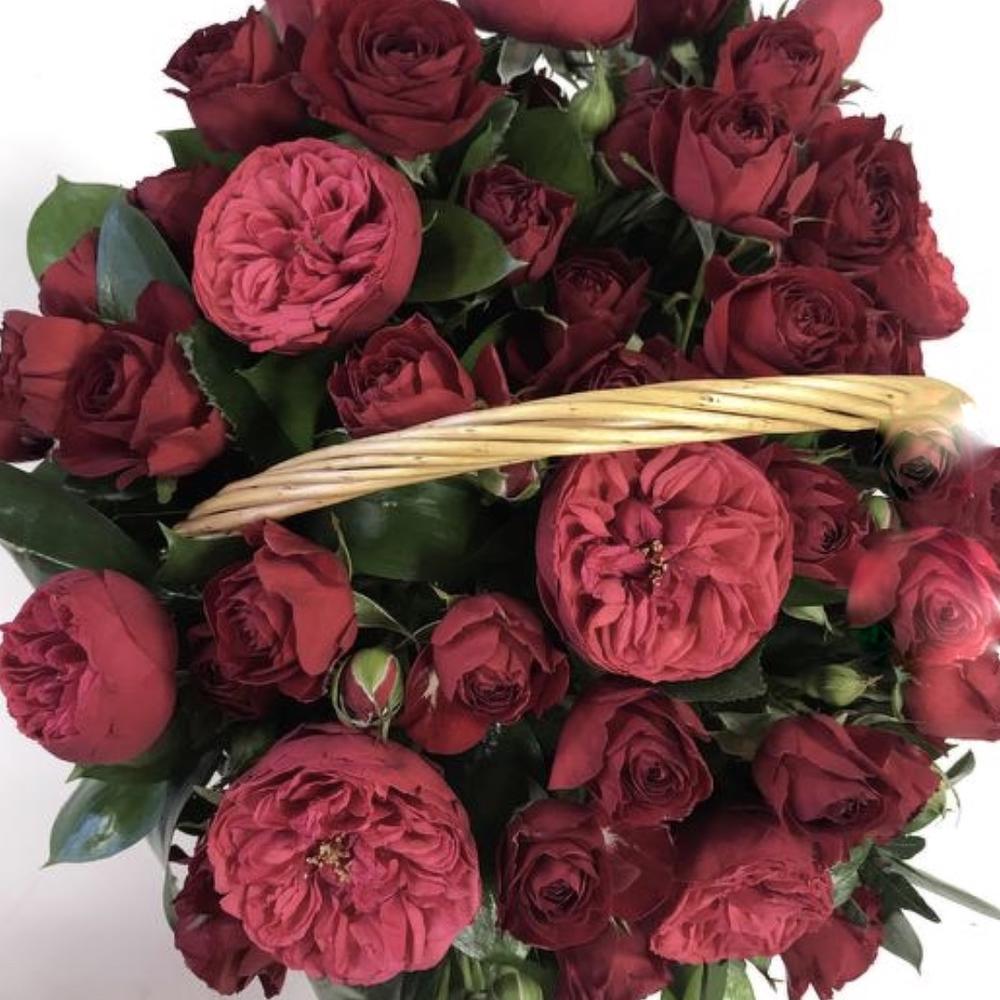 Состав: Роза пионовидная Red Piano - 9 шт.; Роза пионовидная кустовая - 22 шт.; Корзина дизайнерская - 1 шт.; Оазис флористический - 1 шт.; Рускус - 10 шт.; Фисташка - 10 шт.